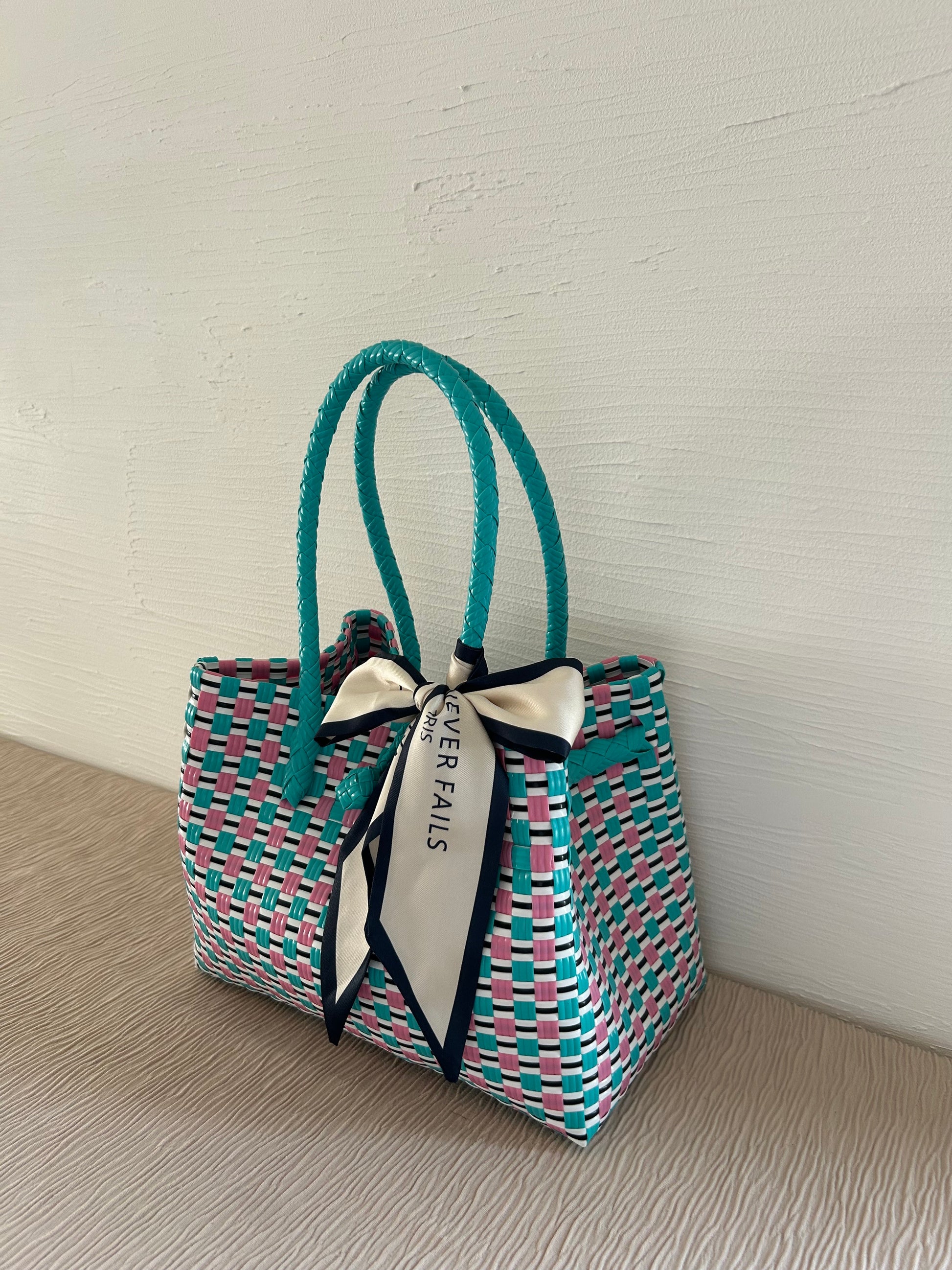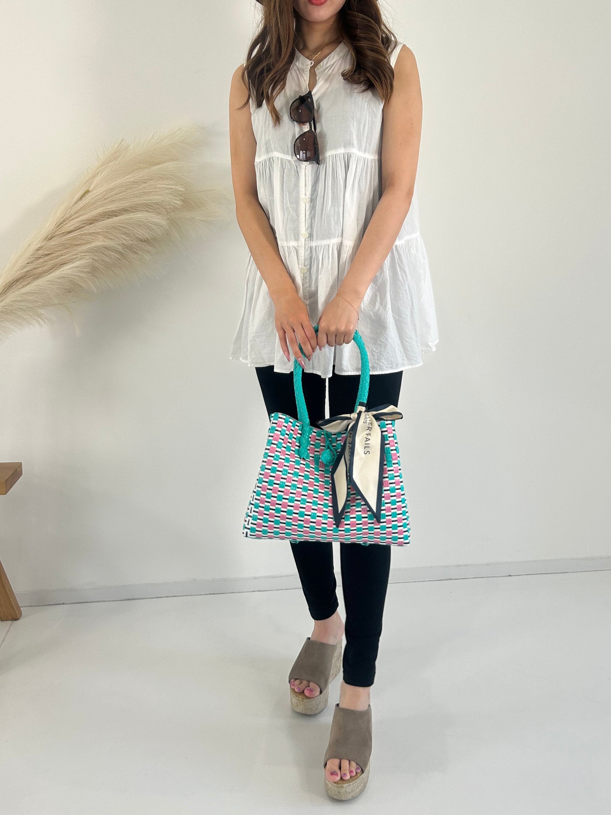 『To Myself』のプラカゴバッグはインドネシアの職人によって手織りで作られており、100%リサイクルプラスチック素材を使用しています。軽量で、耐久性が高く、水に濡れても平気な素材なので水洗いも可能です。日常的なお出かけやショッピング、アウトドア活動など幅広くご使用いただけます。