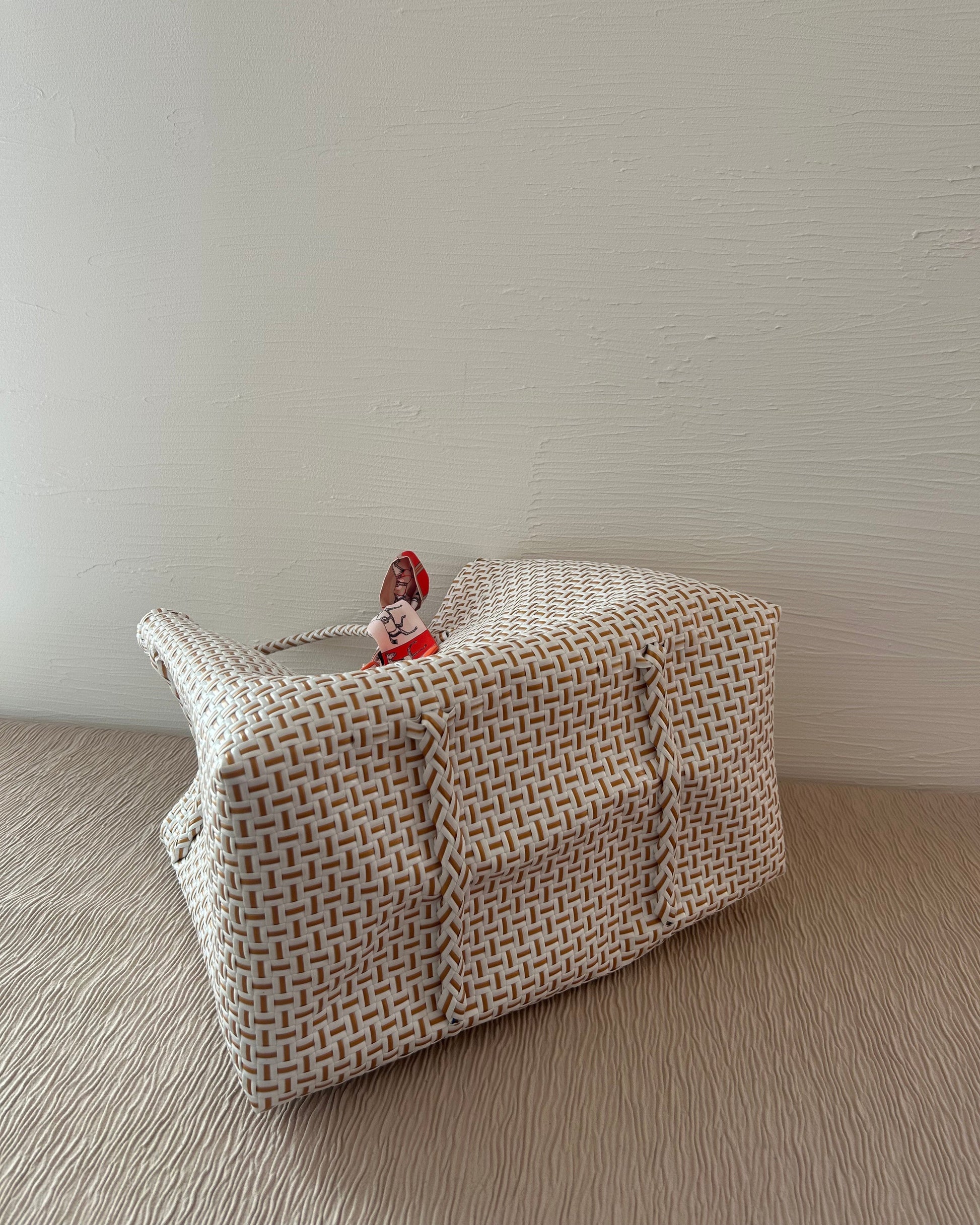 『To Myself』のプラカゴバッグはインドネシアの職人によって手織りで作られており、100%リサイクルプラスチック素材を使用しています。軽量で、耐久性が高く、水に濡れても平気な素材なので水洗いも可能です。日常的なお出かけやショッピング、アウトドア活動など幅広くご使用いただけます。